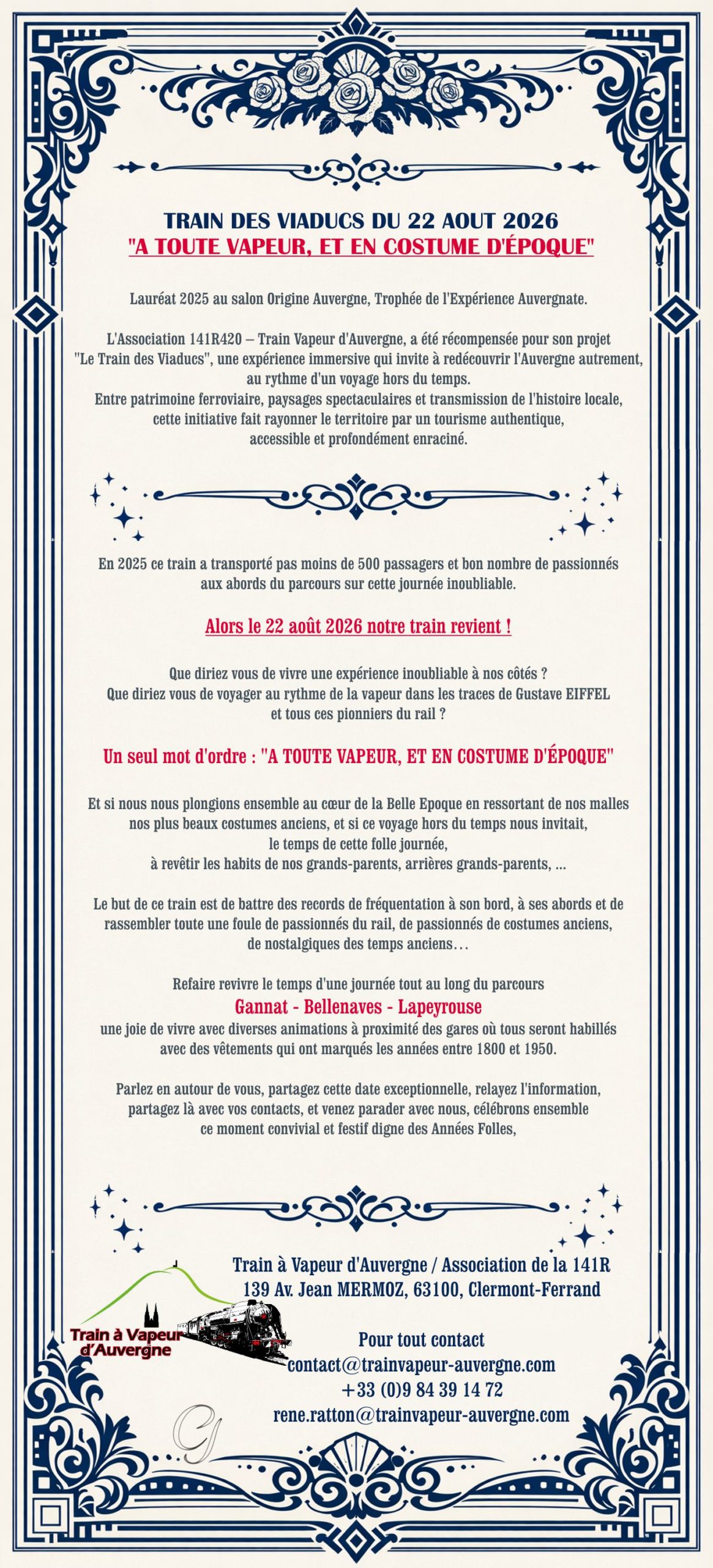 Excursion en train à vapeur le 22 août 2026.